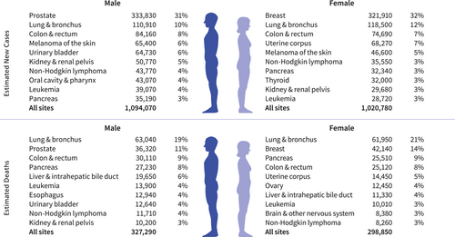 – Leading new cancer diagnoses in men include prostate (around one-third), lung and bronchus, and colorectal cancers, collectively accounting for nearly half of all male cases.