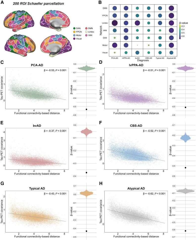 Figure 2. Association between functional connectivity and covariance in tau-PET across variants of AD.
