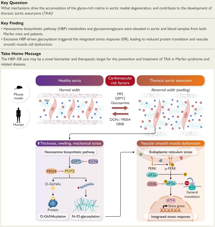 - HBP and ISR represent convergent nodes through which diverse upstream insults might cause medial degeneration. That the HBP–ISR axis is active in both genetic MFS and sporadic human TAAD samples raises the possibility of a shared, targetable disease mechanism.