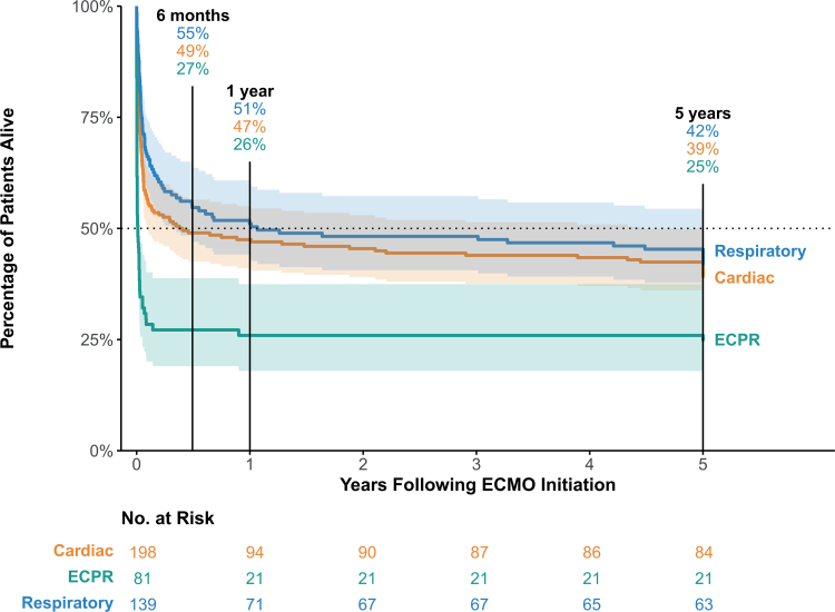 Of 428 patients who received ECMO during the enrollment window, 230 (54%) survived to hospital discharge, 213 (50%) survived to 1 year, and 155 (36%) were alive at 5 years. Five-year survival varied by indication: 42% for respiratory ECMO, 39% for cardiac ECMO, and 25% for extracorporeal cardiopulmonary resuscitation (eCPR). These data provide real-world, contemporary long-term survival estimates from a national, high-volume ECMO network.
