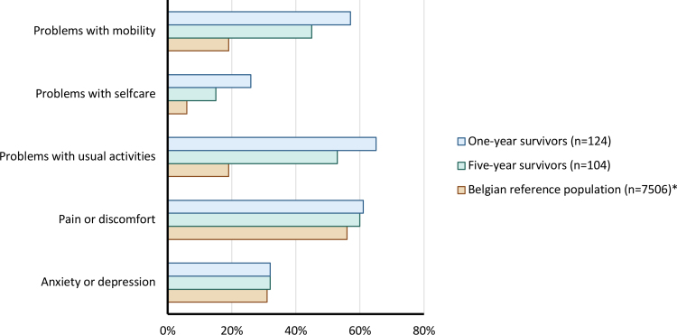 – Five-year survivors reported a median EQ-5D index of 0.82 (IQR 0.73–0.98), indicating overall satisfactory health-related quality of life (HRQoL) despite frequent ongoing problems: pain/discomfort (60%), impairment of usual activities (44%), and mobility limitations (39%).
