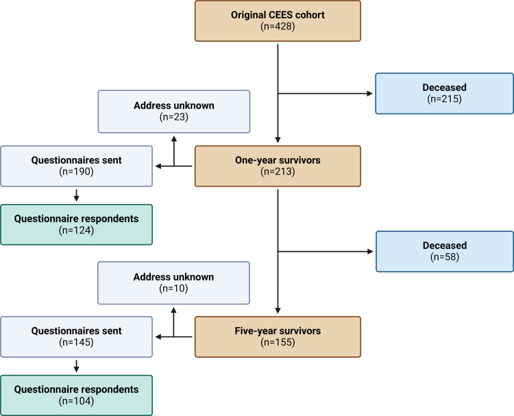 Survival status at 5 years was obtained through linkage with the Dutch municipal records database. All surviving patients at 5 years were invited to complete standardized questionnaires: the EuroQol 5D Five Levels (EQ-5D-5L) instrument for HRQoL, and the Institute for Medical Technology Assessment Productivity Cost Questionnaire for occupational outcomes. No interventions were applied; this is an observational study (ClinicalTrials.gov NCT02837419).