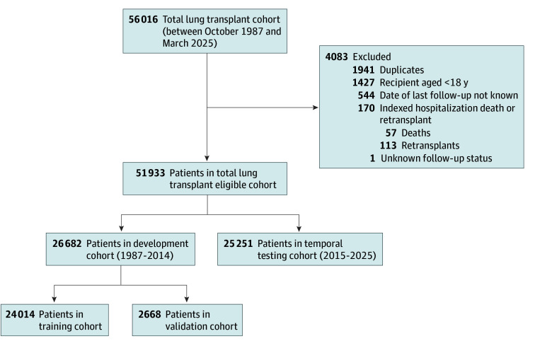 A prognostic study was conducted using data on a cohort from the UNOS-OPTN registry, which captures detailed information on recipients of a lung transplant from across the US. This report followed the Transparent Reporting of a Multivariable Prediction Model for Individual Prognosis or Diagnosis + Artificial Intelligence (TRIPOD+AI) reporting guidelines. This study was conducted using deidentified secondary data from the UNOS registry. The study protocol was reviewed by the institutional review board at University of Texas Southwestern Medical Center and was determined to be exempt from the requirement for informed consent because no direct patient or public involvement was included in the research.