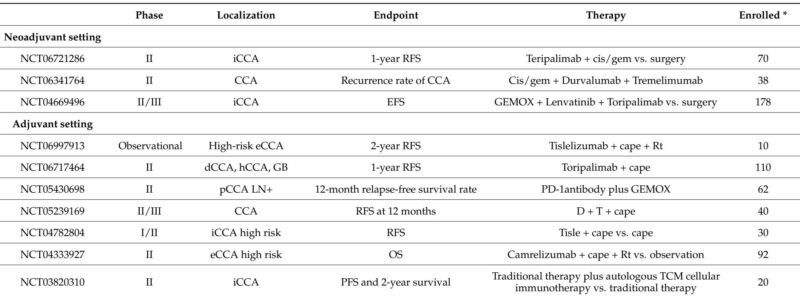 Capecitabine remains the standard adjuvant therapy based on the BILCAP study, though statistical significance was marginal. Recent trials are evaluating the addition of ICIs, alone or in combination with chemotherapy (e.g., durvalumab plus tremelimumab), to reduce relapse risk. Other trials explore combinations with radiotherapy and novel agents such as anti-PD-1/TIGIT bispecific antibodies. These studies aim to improve relapse-free and overall survival post-resection.