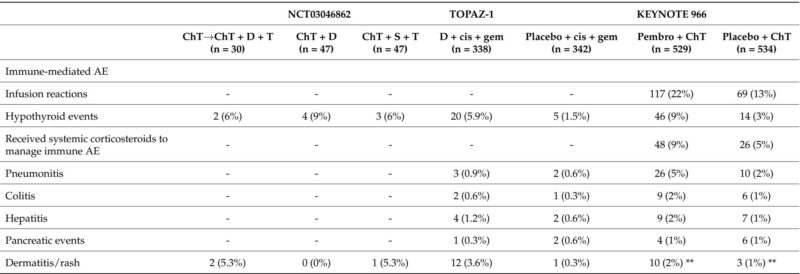 The most notable advances derive from combining ICIs with chemotherapy, elevating outcomes over chemotherapy alone. The Phase III TOPAZ-1 trial demonstrated that durvalumab plus cisplatin–gemcitabine significantly extended median OS to 12.8 months compared with 11.5 months for chemotherapy alone, with improved progression-free survival (PFS) and ORR. Importantly, durvalumab was well tolerated without a marked increase in toxicity. These findings were corroborated by the KEYNOTE-966 trial, where pembrolizumab combined with cisplatin–gemcitabine similarly improved survival compared to chemotherapy alone.