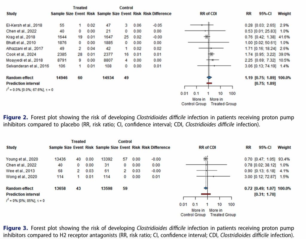 Eight RCTs (29,880 participants) comparing PPIs with placebo found no statistically significant increased risk of CDI (RR = 1.19; 95% CI: 0.75 to 1.89; I² = 0%). Similarly, four RCTs (27,254 participants) comparing PPIs with H2RAs revealed no difference (RR = 0.72; 95% CI: 0.49 to 1.07; I² = 0%). Additionally, three RCTs comparing PPIs with potassium-competitive acid blockers (1,645 participants) showed no significant difference (RR = 1.23; 95% CI: 0.43 to 3.55; I² = 0%). Overall, CDI incidence was low across groups, ranging between 0.3–0.4%.