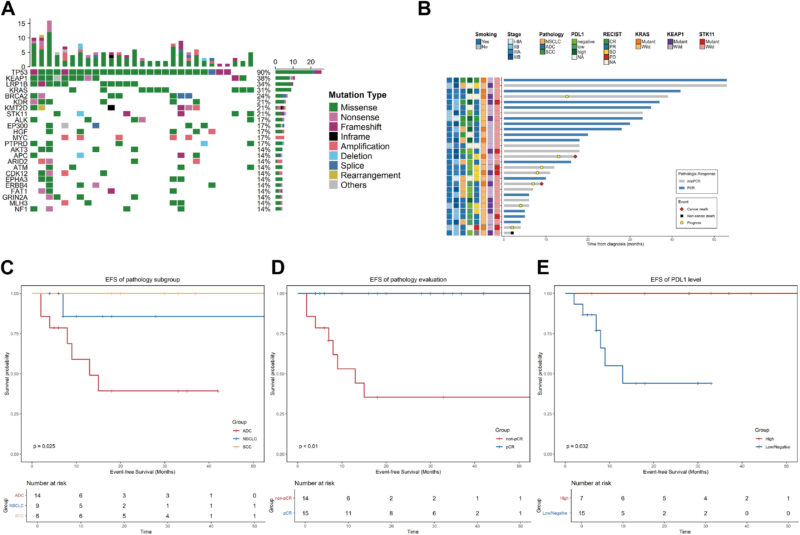 - Relapse and survival: After a median 17‑month follow‑up, seven patients relapsed; one non‑cancer death reported. In the adenocarcinoma subgroup there was a signal for early progression (42.8%) with median EFS ≈13 months, though some adenocarcinoma patients achieved durable disease control.