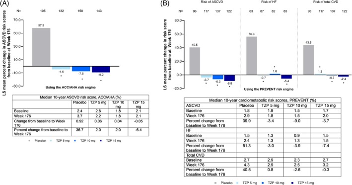 Fig. Effect of tirzepatide on 10‐year predicted risk of cardiovascular outcomes in participants with obesity or overweight and prediabetes. (A) Percent change in 10‐year predicted risk of ASCVD at week 176 in participants with obesity or overweight and prediabetes, using the ACC/AHA risk engine; median ASCVD risk scores at baseline, week 176, change, and percent change at week 176 are presented in the table below the plot. (B) Percent change in 10‐year predicted risk of ASCVD, HF, total CVD at week 176 in participants with obesity or overweight and prediabetes, using the PREVENT risk engine; median risk scores at baseline, week 176, and percent change at week 176 from baseline are presented in the table below the plot. All comparisons of risk reductions from baseline between tirzepatide dose groups and placebo were significant at *p < 0.0001 vs. placebo. The percent change in predicted risk from baseline to week 176 was derived from an MMRM analysis using the SURMOUNT‐1 (3‐year trial) efficacy analysis set. It included data obtained during the treatment period from the mITT (all randomized participants who received at least 1 dose of the study drug), excluding data after discontinuation of the study drug (last dose date +7 days). Source: Only participants with at least one non‐missing post‐baseline value of the response variable were included in the analysis. Change in predicted risk for ASCVD and HF using the PREVENT risk engine was planned as a sensitivity analysis. ASCVD, atherosclerotic cardiovascular disease; BMI, body mass index; CVD, cardiovascular disease; N, number of subjects in the population with baseline and post‐baseline value at the specified time point; MMRM, mixed model for repeated measures; mITT, modified intent to treat; TZP, tirzepatide.