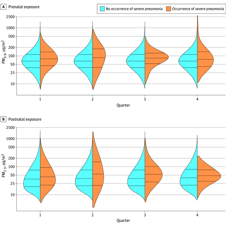 Figure. Density Plots of Prenatal and Postnatal Exposures to Fine Particulate Matter With a Diameter of Less Than or Equal to 2.5 µm (PM2.5) by Infant-Quarter and Severe Pneumonia Status During Infancy.