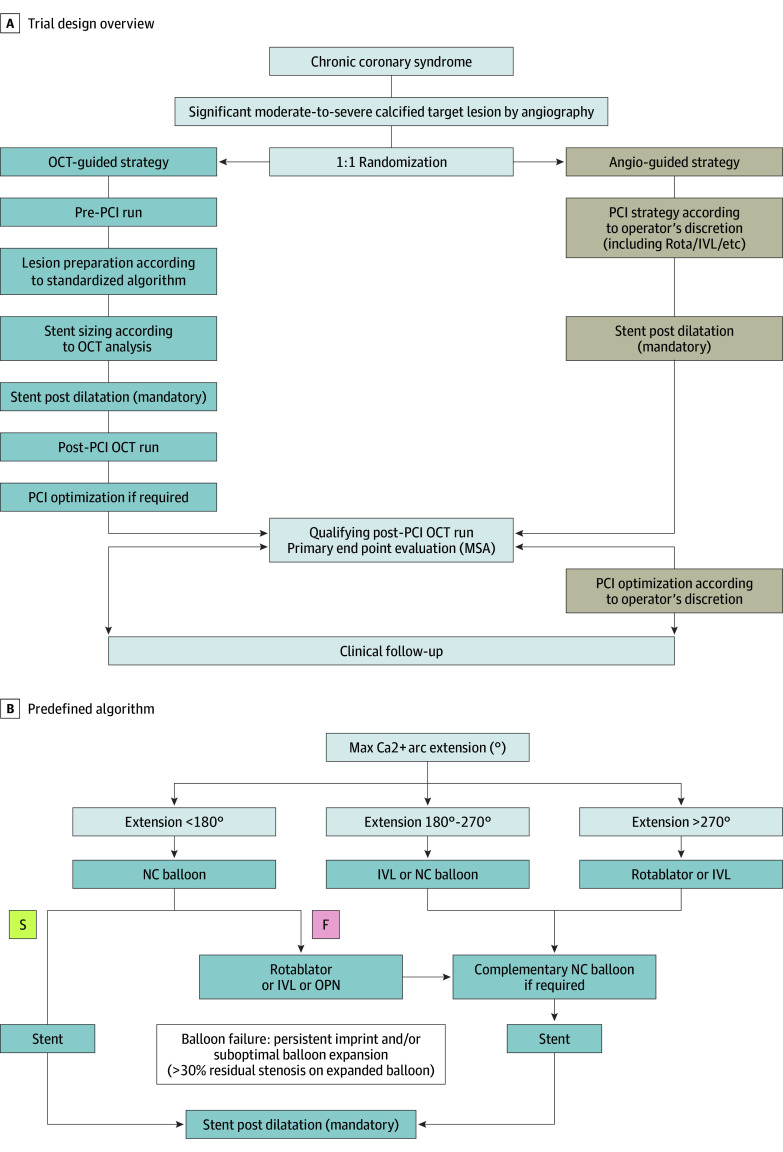 CALIPSO(由OCT指导的钙化病变干预计划)是一项前瞻性、多中心、开放标签的随机临床试验,于2021年12月至2023年6月在法国12个中心进行。符合条件的患者包括患有稳定冠状动脉疾病且血管造影识别出中重度钙化病变并计划进行PCI的患者。诊断性血管造影后,患者按1:1随机分配至OCT指导下的PCI组或血管造影指导下的PCI组。OCT组使用基于OCT测量的预定义标准化管理算法来指导病变准备和器械选择。
