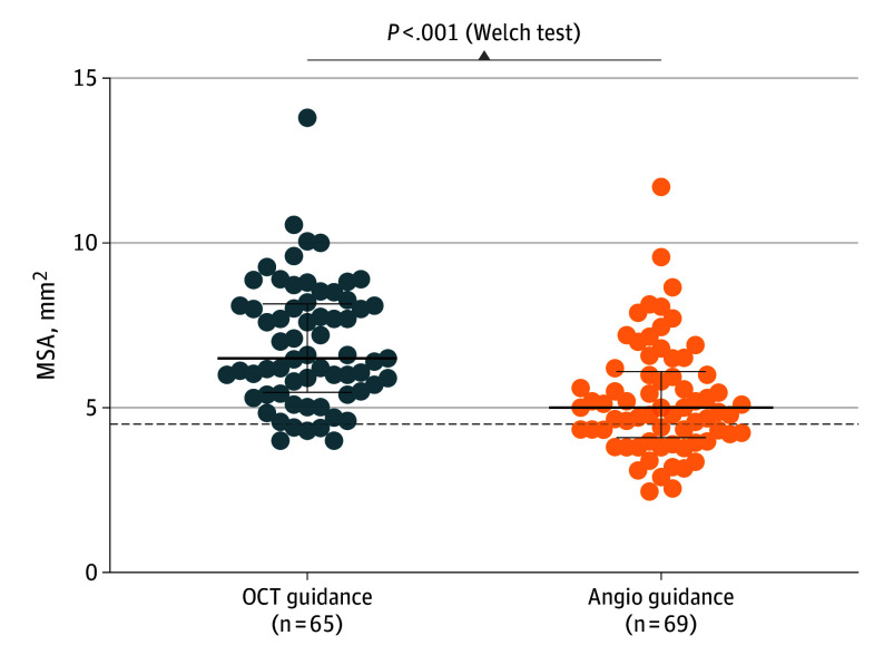 PCI后的最终中位MSA由OCT测量,在OCT指导组显著大于血管造影指导组:6.5 mm²(四分位距5.5–8.1)vs 5.0 mm²(四分位距4.1–6.1),P <.001。这代表了在由OCT衍生的病变评估和预设算法指导下的管理中,钙化病变支架扩张的临床上有意义的改善。