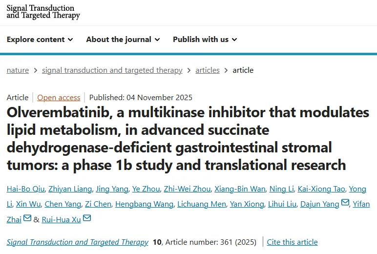 11月4日,由中山大学肿瘤防治中心徐瑞华教授领衔的一项临床1b期研究成果发表在国际顶级期刊《信号转导与靶向治疗》(Signal Transduction and Targeted Therapy,IF=52.7)。研究首次证实新型多激酶抑制剂奥雷巴替尼在琥珀酸脱氢酶(SDH)缺陷型胃肠道间质瘤(GIST)治疗中展现卓越疗效,其中位无进展生存期(PFS)达到25.7个月,较传统治疗方案显著提升。该研究不仅是目前全球规模最大的琥珀酸脱氢酶缺陷型胃肠道间质瘤前瞻性临床试验,更通过多组学分析首次揭示该药物通过调控脂质代谢发挥抗肿瘤作用的全新机制。